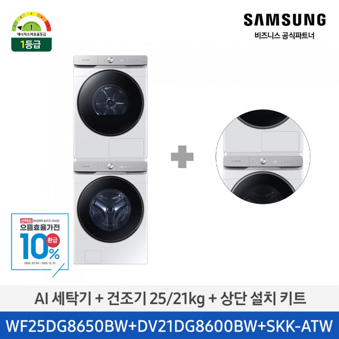 • [12개월무이자]★으뜸효율★[삼성] AI 세탁기+건조기+상단설치키트 (세탁기25kg+건조기21kg)/화이트)(1등급) [WF25DG8650BW2T] 10월