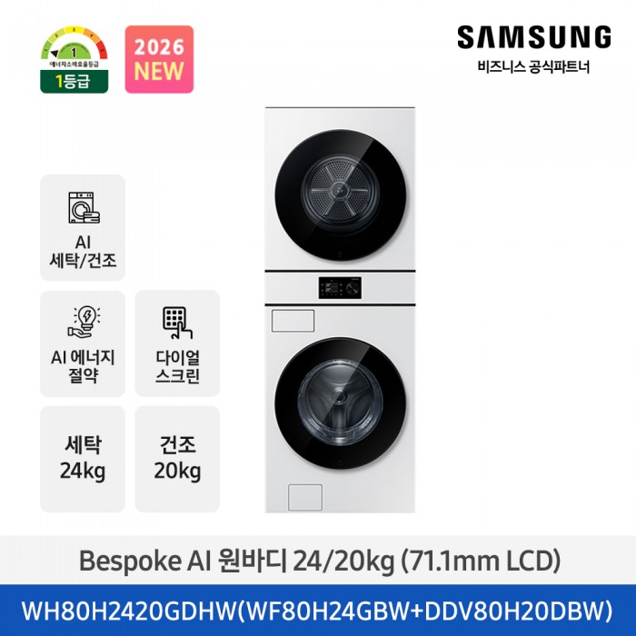 ★2026 NEW★[삼성] Bespoke AI 원바디 세탁기+건조기 24/20kg (화이트)(1등급) [WH80H2420GDHW] 4월 > 세탁기+건조기